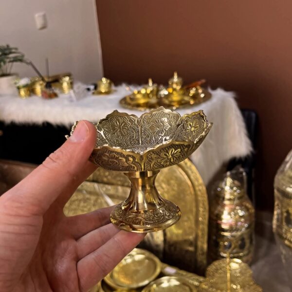 امنح جلساتك هيبة خاصة مع صحن النحاس الأصيل. تصميم بـ “رجل” مرتفعة لتمييز المائدة، ولون ذهبي ساطع يعكس ذوقك الرفيع.