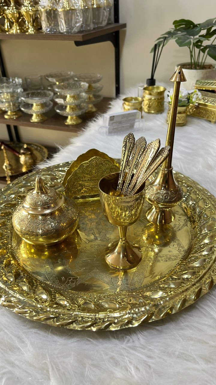أكملي فخامة مائدتك بطقم متكامل من النحاس الذهبي الثقيل، يجمع بين الأناقة والوظيفة في آن واحد.