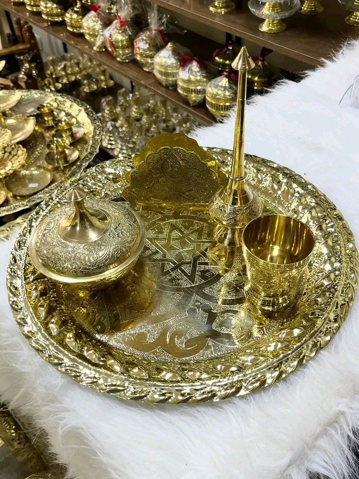 طقم الضيافة الملكي (4 قطع) أكملي فخامة مائدتك بطقم متكامل من النحاس الذهبي الثقيل، يجمع بين الأصالة والوظيفة في آن واحد.